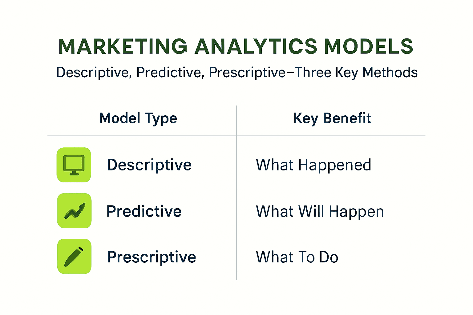 Three primary analytics models help marketers transform data into strategy and execution. Each builds on the previous to guide you from understanding past performance to taking optimized future actions.