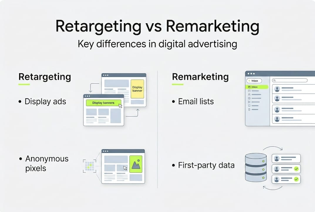 Retargeting uses display ads served across external networks, based on anonymous user behavior tracked via pixels. Remarketing, in contrast, typically relies on email campaigns and first-party data, targeting known contacts who have already shared their information with you.